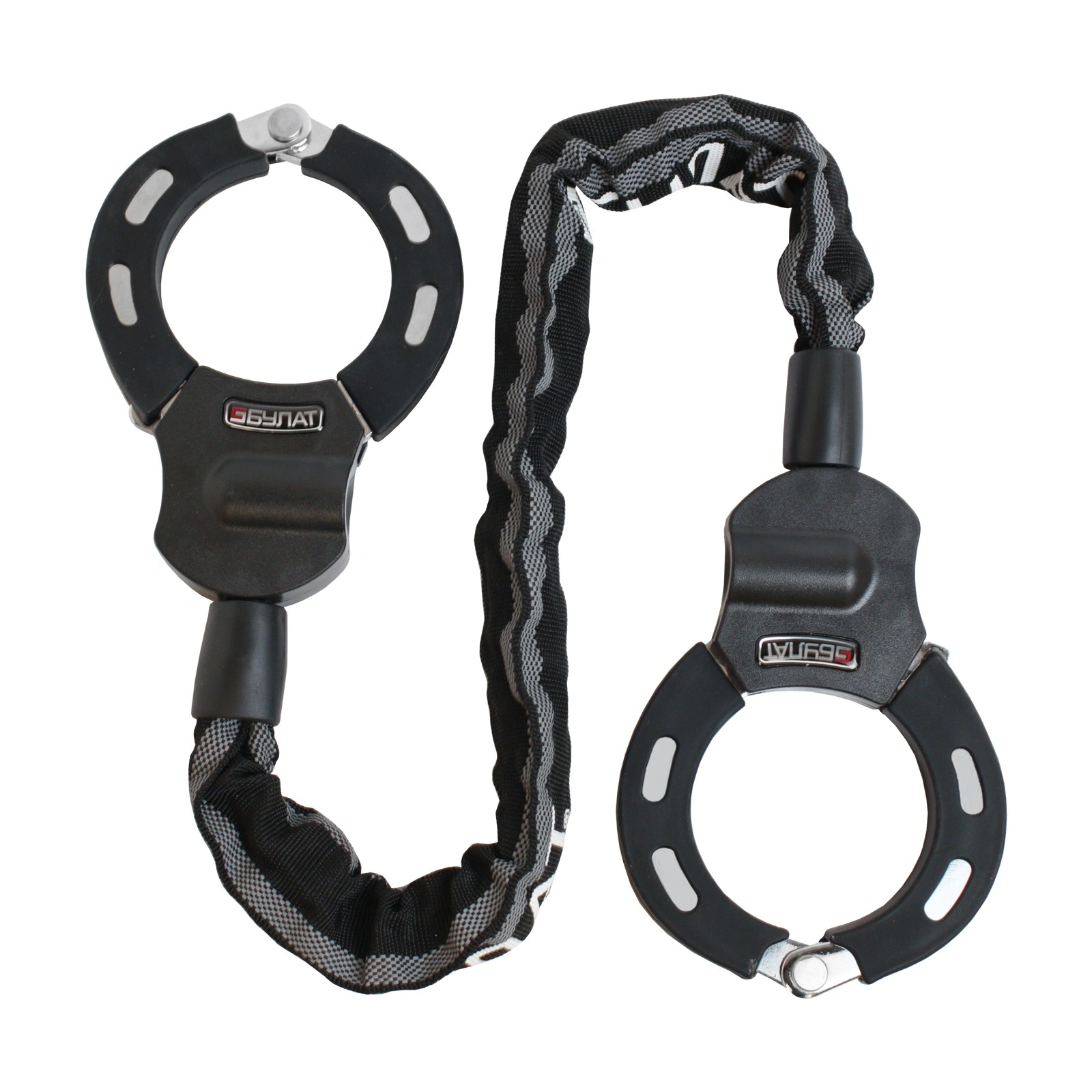 - Цепь- закаленная легированная сталь в защитном светоотражающем кожухе. - Диаметр звена цепи 6 мм длина цепи 650 мм - Внутренний диаметр наручника - 75 мм Сертифицирован в РФ. Гарантийный срок 5 лет.