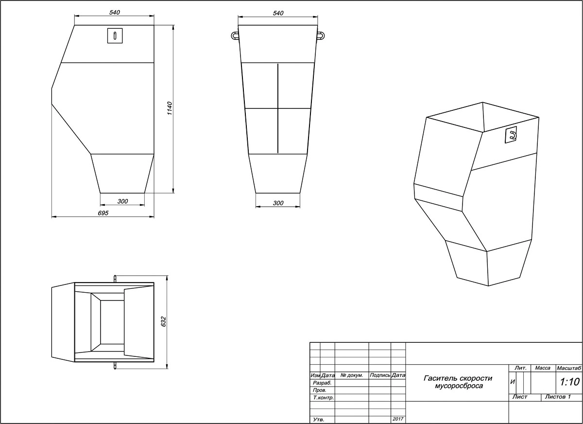 Гаситель скорости мусоросброса изготовлен из стали. Предназначен для снижения скорости падения строительного мусора. Предотвращает повреждения остальных секций мусорного рукава и установленных мусорных контейнеров.