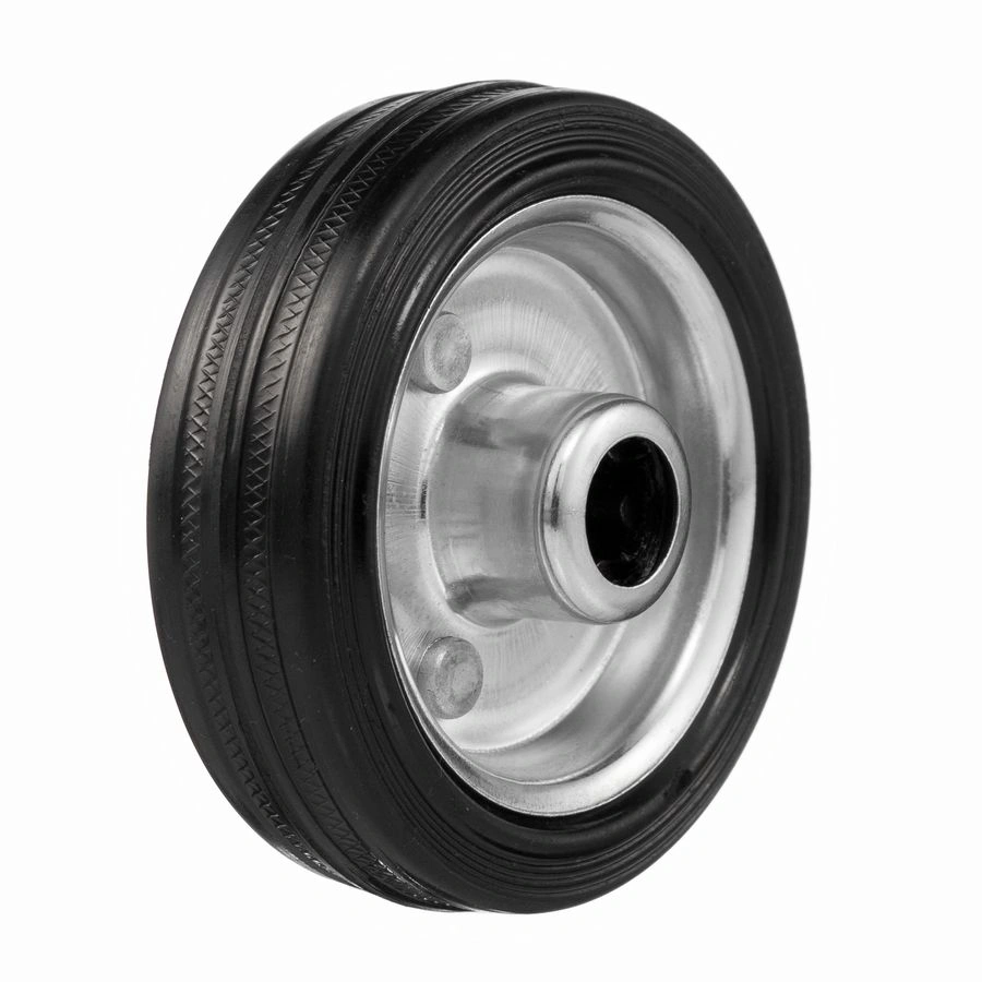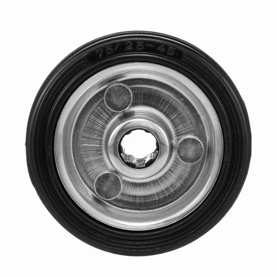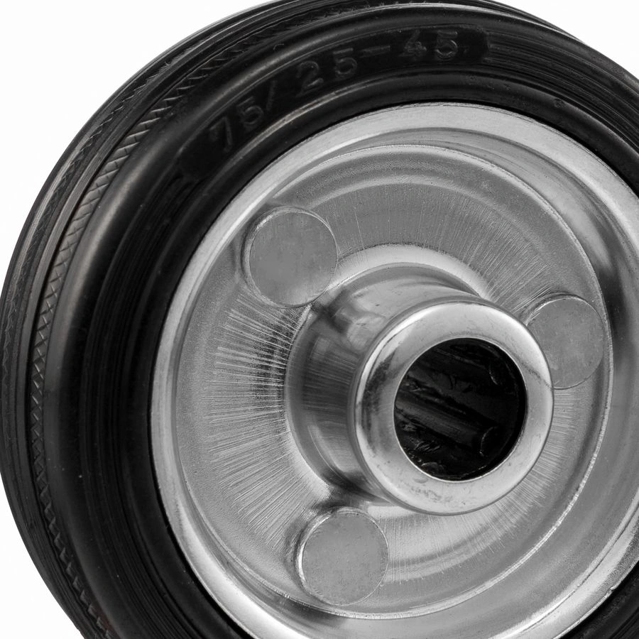Колесо под ось 12 мм. 4000-75, диаметр 75мм., грузоподъемность 50кг., Колесо из черной литой резины. Центр из стального оцинкованного обода из штампованной стали. В оси колес роликовый подшипник. Колеса из черной резины, центр из двух гальванизированных дисков из штампованной стали. Роликовый (игольчатый) подшипник расположен в углублении, выдавленном под прессом, и содержит цилиндрические ролики подшипника. Возможно применение на относительно грубых полах складов, заводов, производственных и строительных площадках. Данные колеса можно использовать на неровных поверхностях, во влажной окружающей среде и использовании вне помещения, не рекомендуется применять в среде с органическими растворителями, хлорированными веществами, гидрокарбонатами и минеральными маслами. Температура эксплуатации от -20 до +70С.
