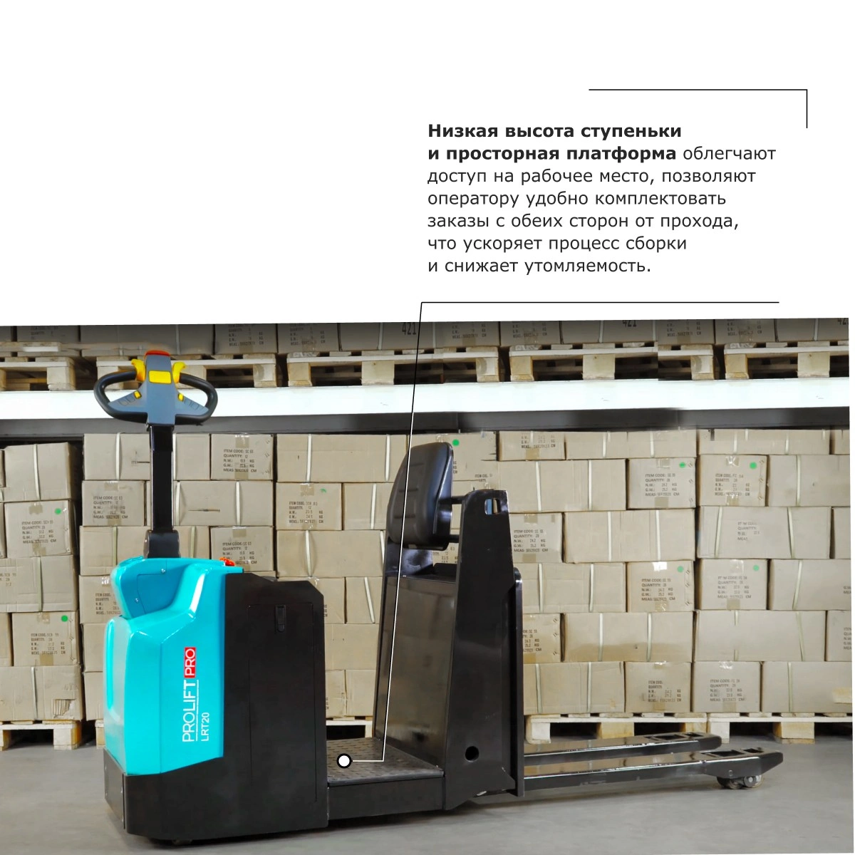 - Низкая высота ступеньки и просторная платформа облегчают доступ на рабочее место, позволяют оператору удобно комплектовать заказы с обеих сторон от прохода, что ускоряет процесс сборки и снижает утомляемость.