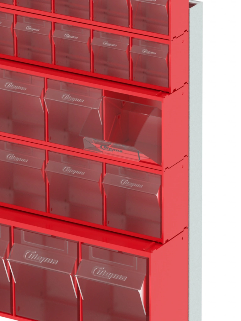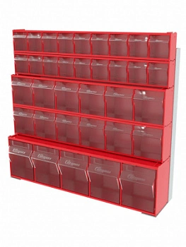 Стойка настенная/настольная Стелла-техник 401-02-02-01 (610х150х500) представляет собой удобную систему хранения, которая подойдет для выставочных залов, магазинов, офисов, складов. Основание можно установить на стол или закрепить на стену, привернув его анкерными болтами или саморезами (в комплект не входят). В комплект стойки входит: Рама FOX (610х150х500) V401 - 1 шт.; Короб откидной Стелла-техник F-600-9 , 600х68х78мм, 9 ячеек, красный, прозрачный -2 шт.; Короб откидной Стелла-техник F-600-6 , 600х96х112мм, 6 ячеек, красный, прозрачный – 2 шт.; Короб откидной Стелла-техник F-600-5 , 600х140х168мм, 5 ячеек, красный, прозрачный – 1 шт.; Упаковка. Преимущества стойки: Металлическое основание; Значительная устойчивость; Хорошая вместимость; Длительный срок службы.