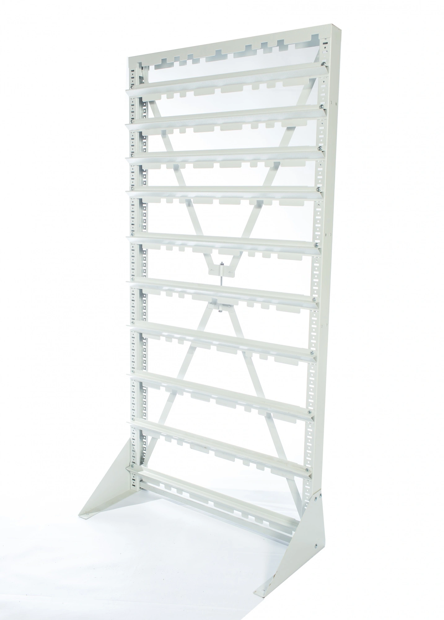 Стойка Стелла-техник V-735х1515мм. без опоры, серия К, для пластиковых ящиков, состоит из металлической рамы, снабженной крестовиной-растяжкой для жесткости конструкции. На вертикальных стойках рамы имеются перфорационные отверстия для закрепления поперечных держателей. Держатели крепятся к раме с помощью саморезов. Высоту держателей можно изменять в зависимости от высоты закрепляемых пластиковых ящиков. В случае необходимости, стойка может закрепляться на передвижной платформе, специально предназначенной для этой цели. В комплект поставки входят: Вертикальная стойка перфорированная 2 шт.; Верхняя планка-опора 1 шт.; Полукрестовина для стяжки стойки 2 шт.; Шпилька резьбовая диаметр 8мм. для стяжки полукрестовин 1 шт.; Гайка М8 для шпильки резьбовой 2 шт.; Шайба М8 для шпильки резьбовой 2 шт.; Саморезы диаметр 6мм. на 1 держатель 2 шт.