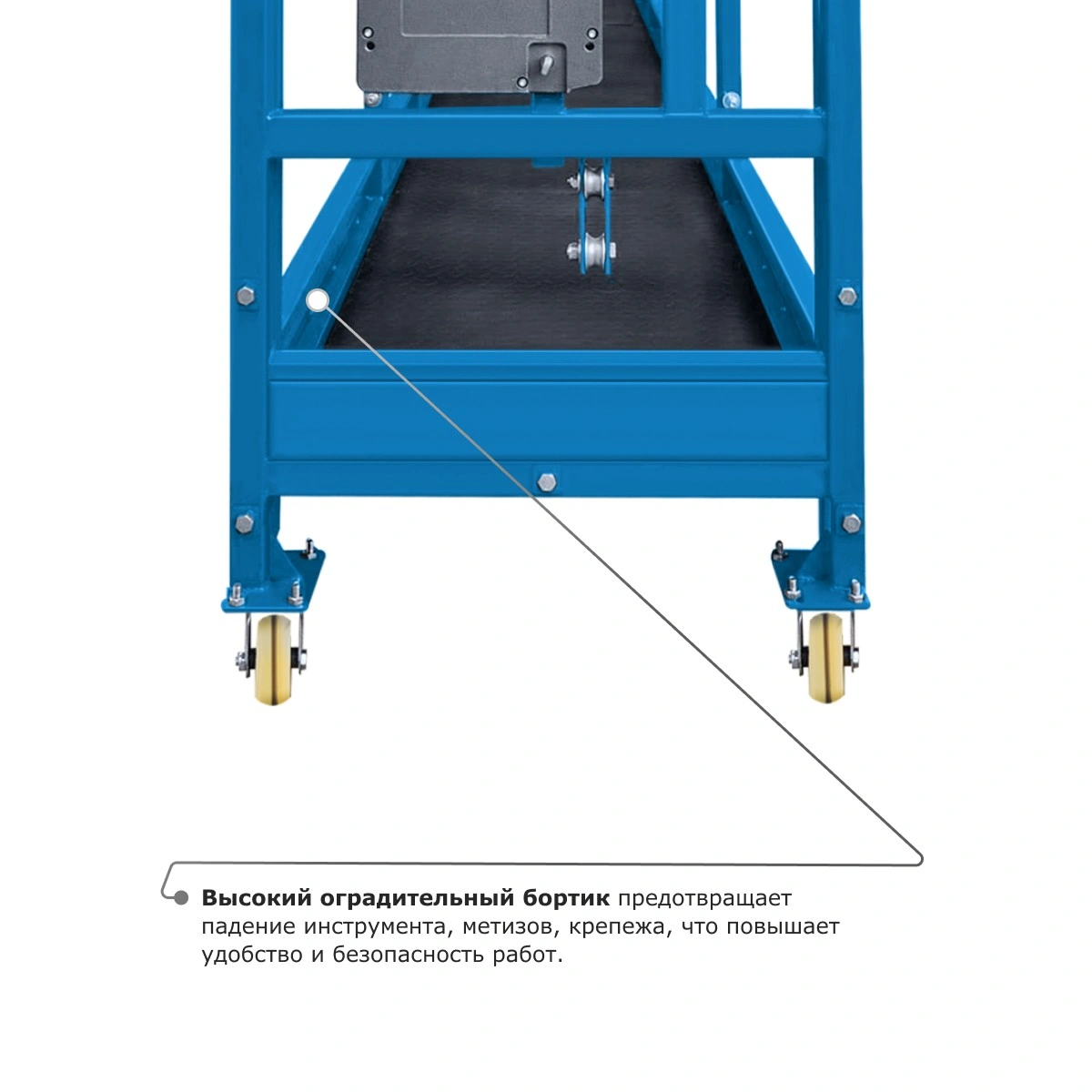 - Высокий оградительный бортик предотвращает падение инструмента, метизов, крепежа, что повышает удобство и безопасность работ.